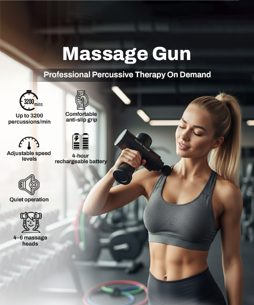 Crafted with a robust motor, multiple interchangeable heads, and adjustable speed settings, this massage gun adapts to your unique muscle recovery needs. Its ergonomic, lightweight design and whisper-quiet operation make it perfect for athletes, fitness enthusiasts, and anyone seeking fast, effective relief at home, the gym, or on the go.