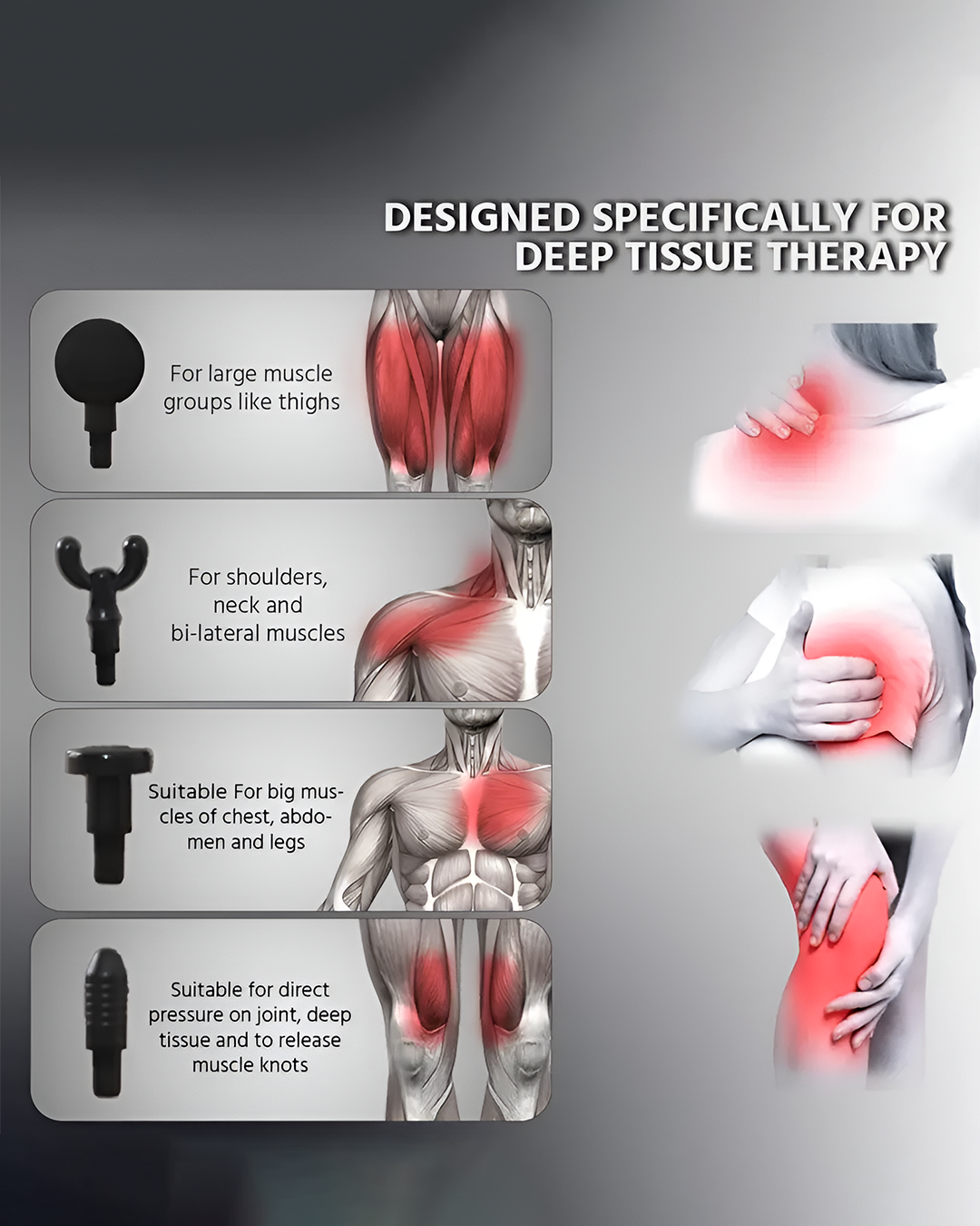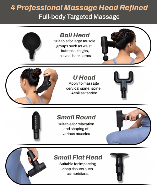 - 4–6 interchangeable massage heads tailored for different muscle groups